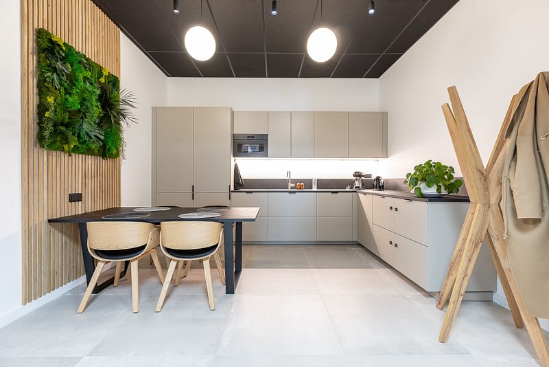 Cette cuisine d’entreprise de 16 m² a été pensée comme un espace fonctionnel et esthétique, visible depuis le showroom. L’aménagement repose sur une implantation fluide, associant lignes épurées, façades mates aux tons doux et contrastes maîtrisés entre bois naturel et noir. Le coin repas, mis en valeur par un cadre végétalisé, et le vestiaire intégré […]